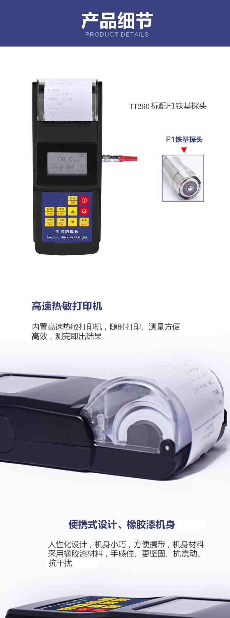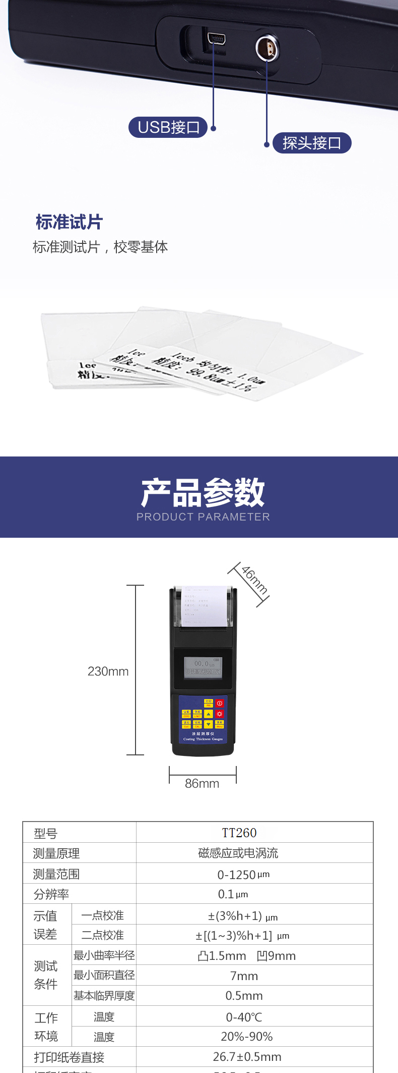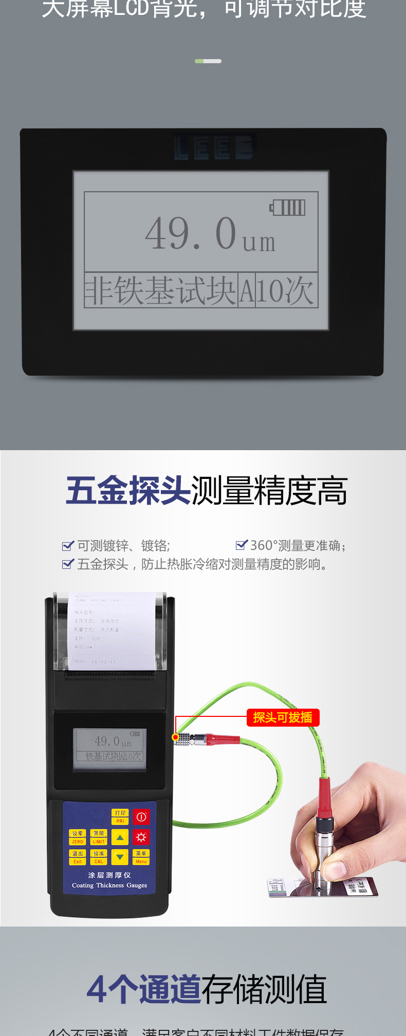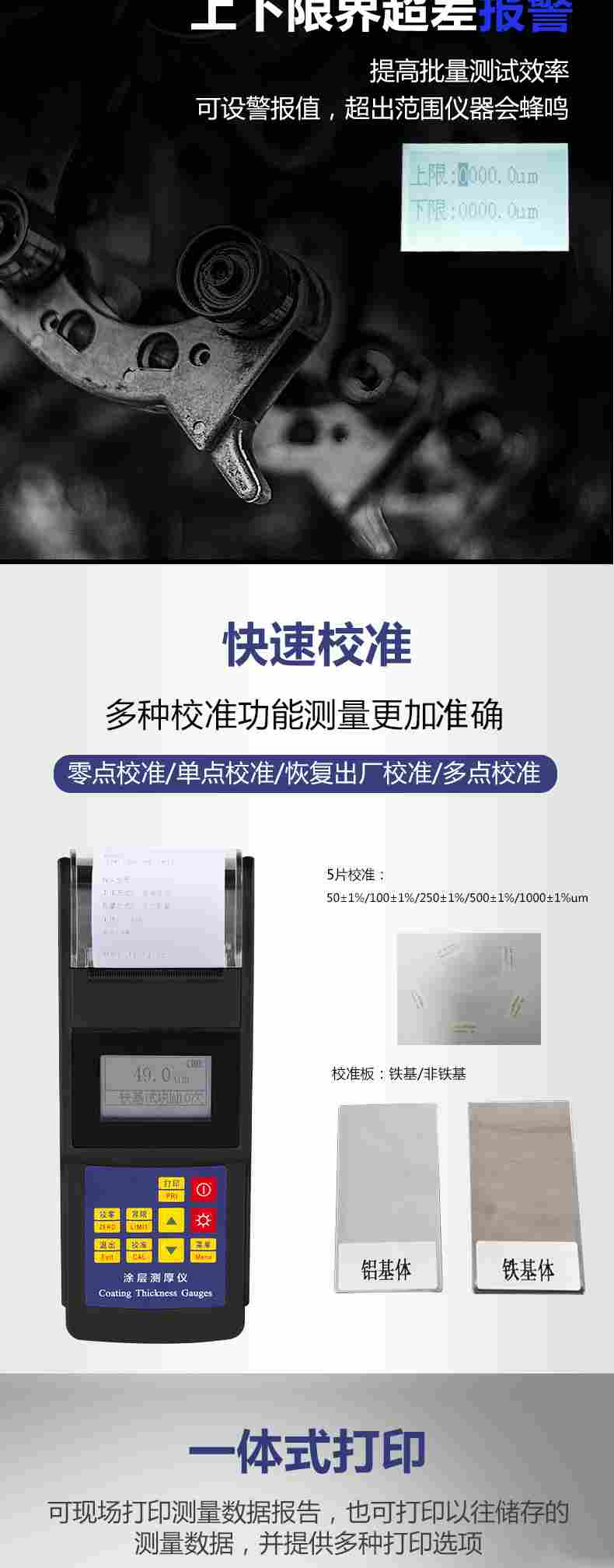 采用磁性和電渦流兩種測量方法,可檢測磁性金屬基體上非磁性覆蓋層的厚度(如鋼、鐵、合金和硬磁性鋼上的鋁、鉻、銅、鋅、錫、橡膠、油漆等),以及非磁性金屬基體上非導電的絕緣覆蓋層的厚度(如鋁、銅、鋅、錫上的橡膠、塑料、油漆、氧化膜等)。
