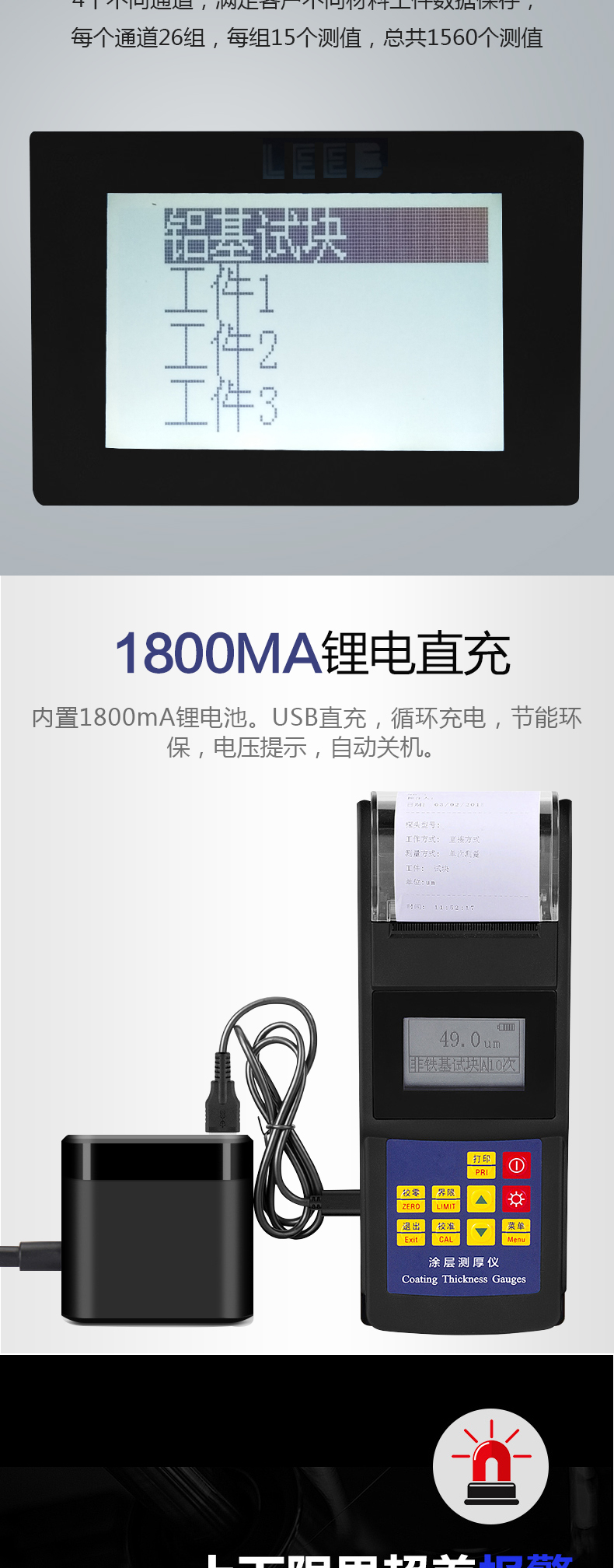 中文菜單:兩種測量方式;兩種工作方式;可儲存500個測量值;數據刪除功能;可設置界限,對界限外的測量值能自動報警;電源欠壓指示;手動和自動兩種關機方式。