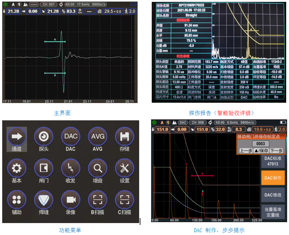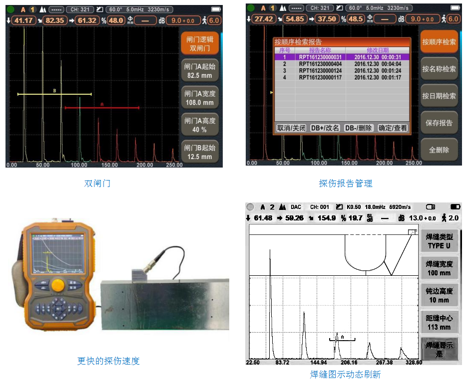 ● 自動增益、回波包絡、峰值記憶功能提高了探傷效率;