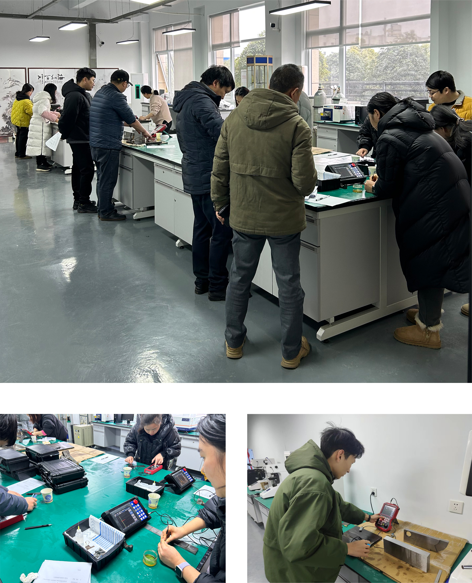 此次“比武”挑選了淬火硬化層深度測(cè)量?jī)xU8001、超聲波探傷儀U981和高精度超聲波測(cè)厚儀U381三種優(yōu)勢(shì)產(chǎn)品,歷時(shí)2天,分別考察理論和技能實(shí)操兩個(gè)部分。