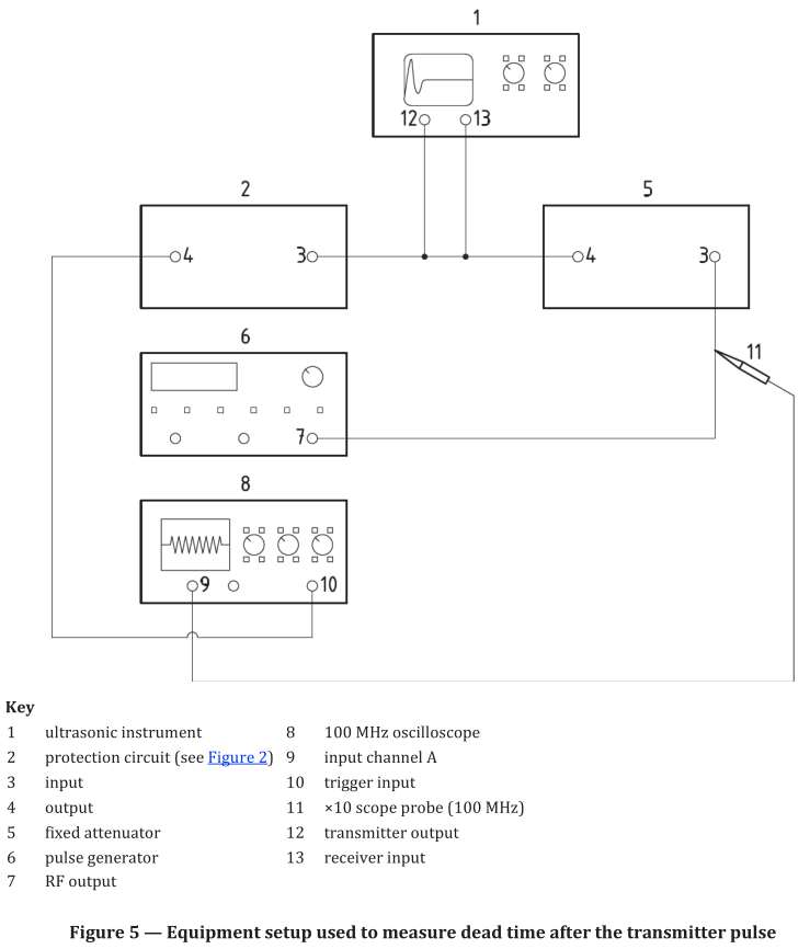 見EN12668.1:2010和ISO22232-1-2020中的相應部分,得出的是時間,一般要求是不大于10μs。ISO22232-1-2020規(guī)定的測試示意圖如下:
