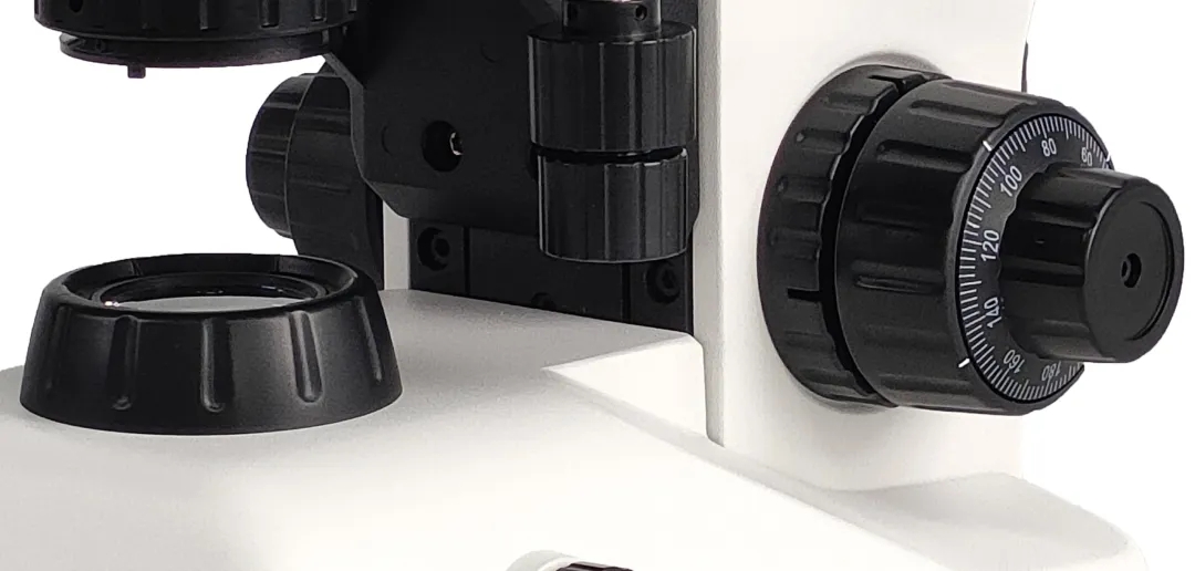 低手位粗微同軸調(diào)焦機(jī)構(gòu),微調(diào)精度0.002mm,帶有防止下滑的調(diào)節(jié)松緊裝置和機(jī)械上限位裝置。
