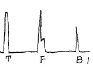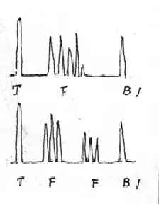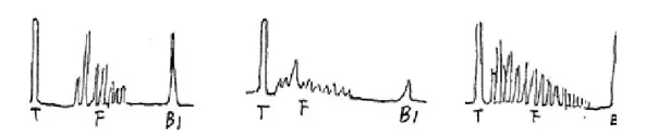 軸類鍛件中的縱向內(nèi)裂,直探頭圓周探傷,聲束平行于裂紋時(shí),既無(wú)底波也無(wú)傷波,當(dāng)探頭轉(zhuǎn)動(dòng)90°時(shí)反射波最強(qiáng),呈現(xiàn)裂紋波形,有時(shí)會(huì)出現(xiàn)裂紋的二次反射,一般無(wú)底波。底波與傷波出現(xiàn)特殊的變化規(guī)律(如圖)。